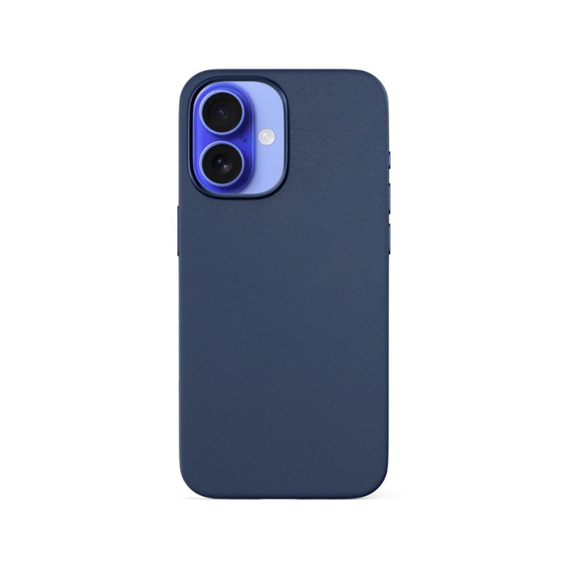 Smartphone case, for Apple iPhone 16 Plus, MagSafe compatible, genuine leather material, aluminium buttons, aluminium frame around the lenses, colour blue