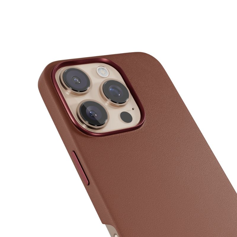 Smartphone case, for Apple iPhone 16 Pro, MagSafe compatible, genuine leather material, aluminium buttons, aluminium frame around the lenses, colour brown
