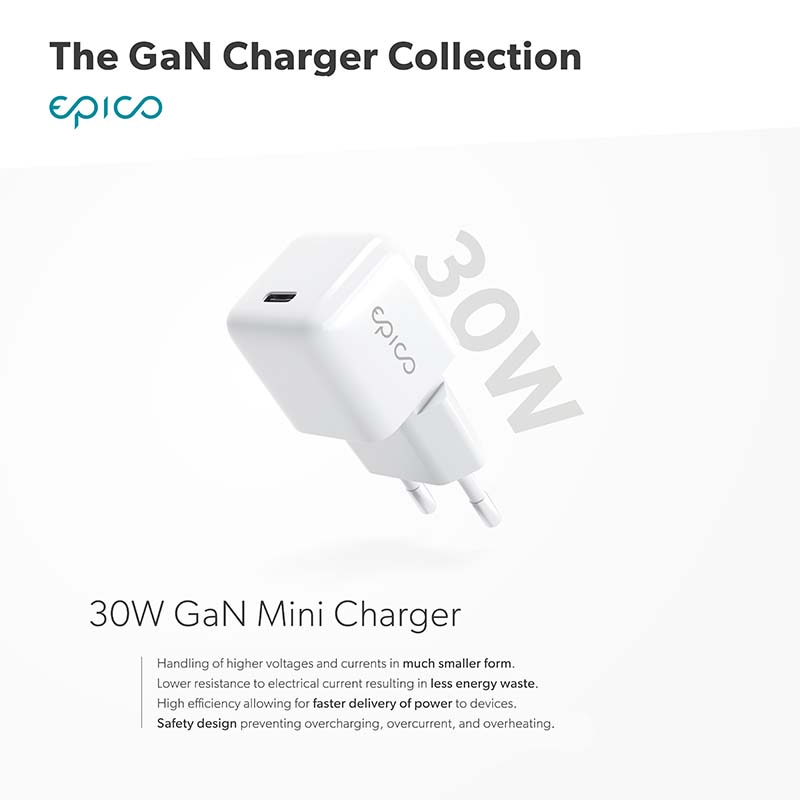 Epico 30W GaN Mini Charger is a compact and highly efficient charger that achieves great charging results thanks to GaN technology. With a maximum power of up to 30W, it is a suitable and versatile adapter for charging your Apple devices such as iPhones, all iPad models and MacBooks with M1 chip. Gallium Nitride (GaN) produces less heat, allowing individual components to be closer together. This makes the GaN charger compact and lightweight, weighing only 55 g. Charging speeds are up to five times faster than standard chargers (speeds depend on your device type).Input voltage/current: 100-240V (50-60Hz) 0.6A, USB-C output: 30W max., Maximum output: 30W,  Material: ABS, PC, Dimensions: 35×70×30mm, Weight: 55g