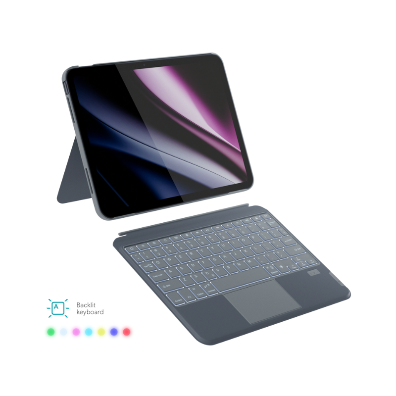 Pouzdro na tablet Apple iPad Pro 11", iPad Air 10,9”, iPad Air 11” s podsvícenou klávesnicí, připojení přes Bluetooth, multidotykový trackpad, integrovaný stojánek, kabel USB-C na USB-C, CZ klávesnice